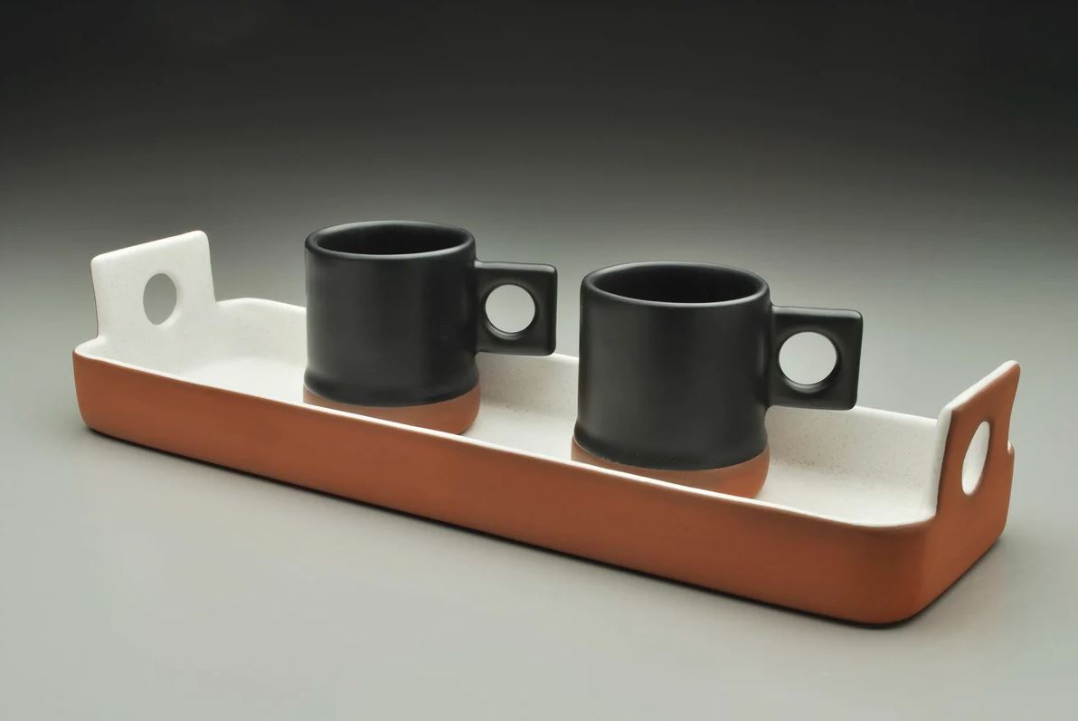 Paul creates his ceramic pieces using a casting process in molds that he personally designs and makes. The clay used is a red stoneware that has been fired to vitrification; this yields a tough, nonporous surface. The glazes are all lead free.