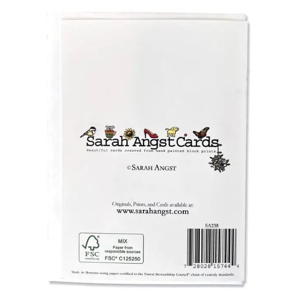 This 5" x 7" blank card features an image from an original linocut by Sarah Angst of Bozeman, Montana. The card includes a coordinating white envelope.