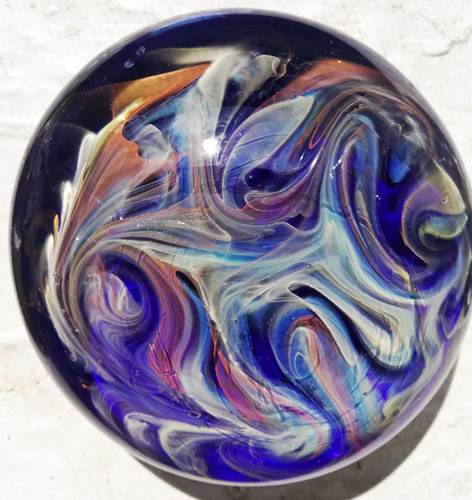 I use a propane/oxygen mix torch to melt and shape glass. The color is colored borosilicate glass rods or powder melted directly into clear glass tubing. Forms are blown and sculpted in the flame and then annealed in a kiln.