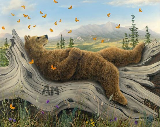 In Robert Bissell’s magical realism paintings, animals are a mirror for human existence, self-definition, and reflection. Bissell grew up on a farm in the English countryside, immersed in a world of animals and literature, and he incorporates both in his art and writings. His explorations of zoomorphism—portraying humans as non-humans—prompt us to ponder the environment, death and renewal, the stages of transition, and the mystery of life. He invokes a sense of peace and harmony in his allegorical paintings and dreamy landscapes, and continually investigates the nature of spirit. He divides his time between London and San Francisco and exhibits regularly in the UK and the US.