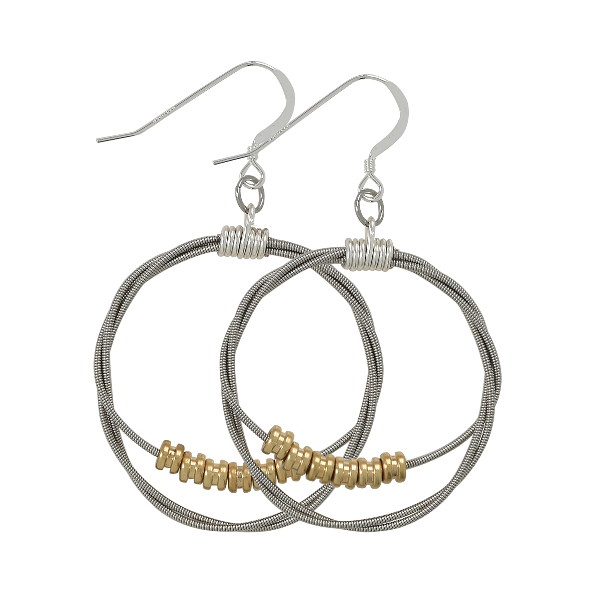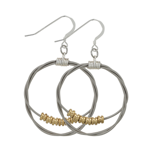 Electric guitar string hoops with brass ball end beads. Finished with silver jewelry wire and stainless steel ear wires.