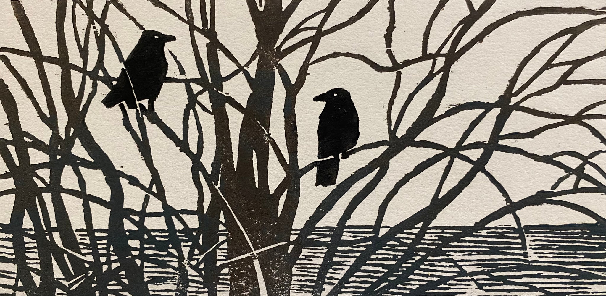 His works are inspired by nature, particularly of the rolling hills of the Driftless Region. While Brian has always been drawn to watercolor, he recently began making woodblock prints. Using wood scraps, he carves out a design, creating a relief printing block. He then inks the block, press paper against it, and rub the back using a "baren". Brian dreams of having a beautiful Japanese baren but for now, he uses an old wood cabinet knob as his baren.