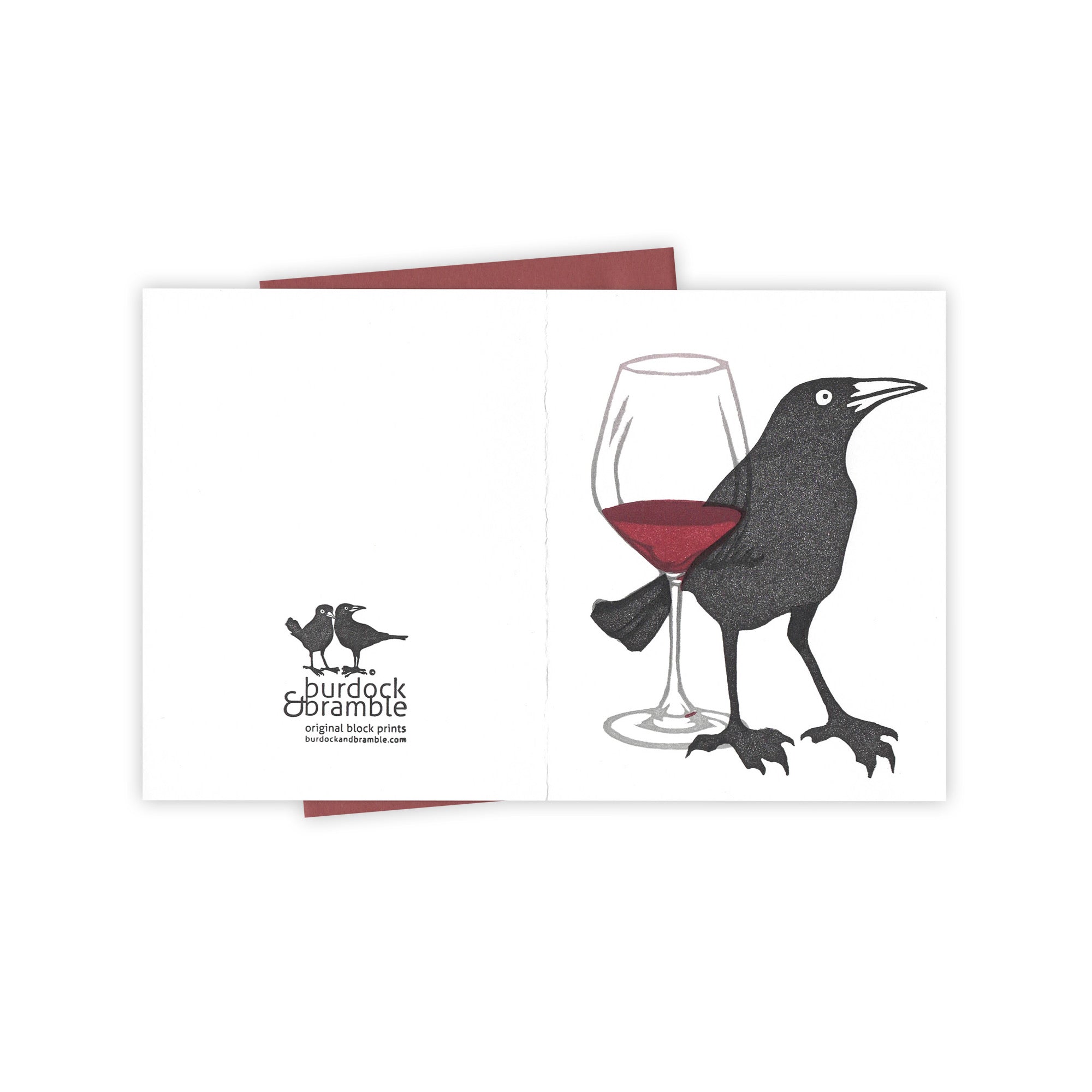 Original block print folded card on 100% cotton paper featuring a hand-carved, letterpress-printed grackle enjoying a glass of red wine.