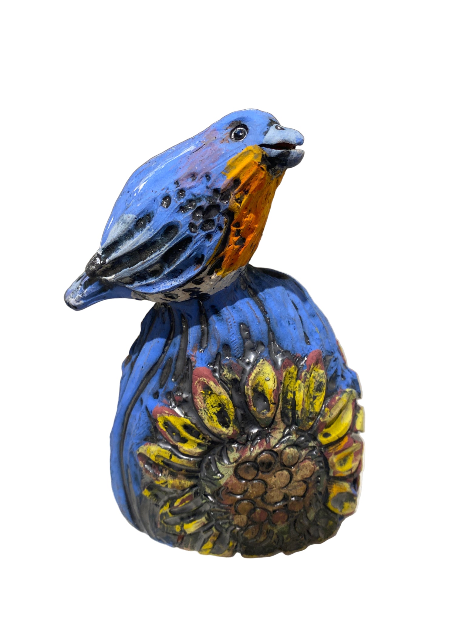 This carved vase is made of red earthenware clay and lined with a metallic black liner glaze. The rich, matte surface features vivid sunflowers that are accented with a white slip and layered underglazes. A blue bird perches on the top.
