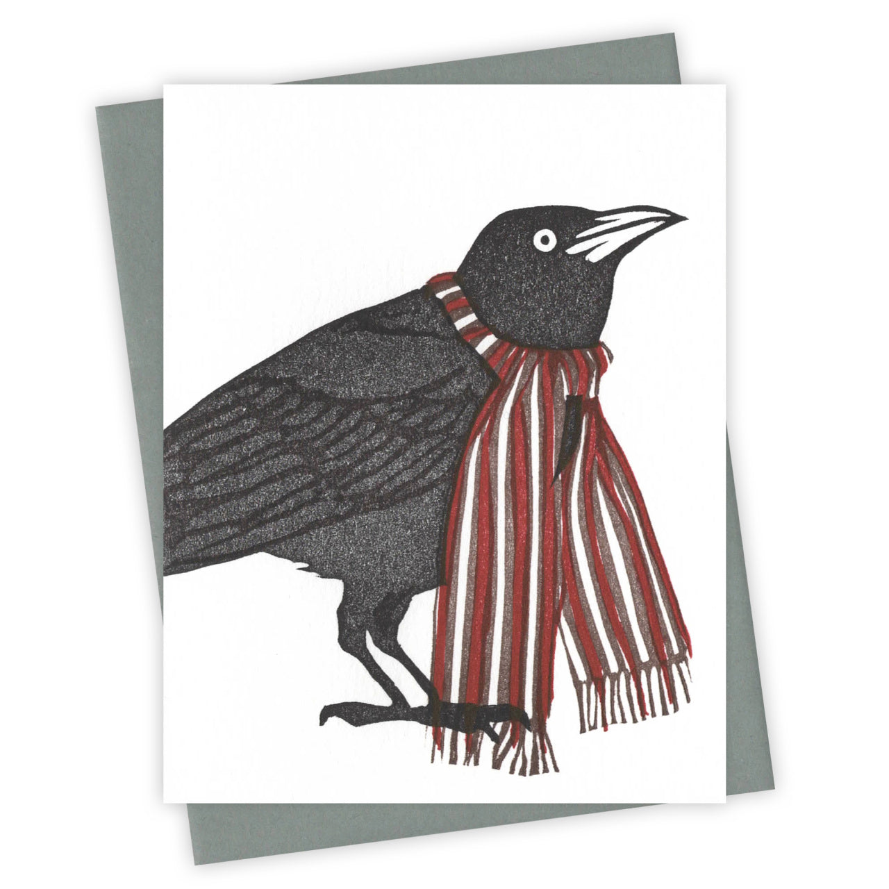 Original block print folded card on 100% cotton paper featuring a hand-carved, letterpress-printed grackle wrapped up for winter weather in a striped scarf.